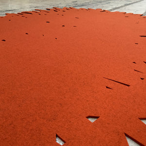 Der Teppich Vermino wirkt wie eine Kritzelei – wie eine ziellose Zeichnung, die in einen Teppich verwandelt wurde. An mehreren Stellen kann man durch den Teppich hindurch auf den Boden darunter sehen.